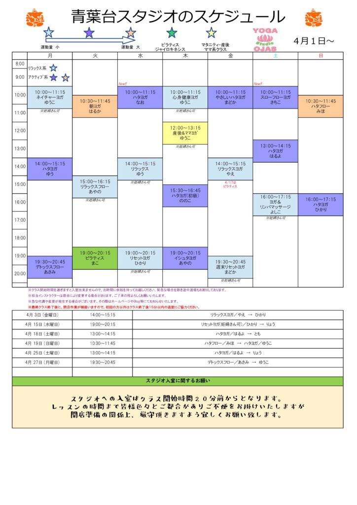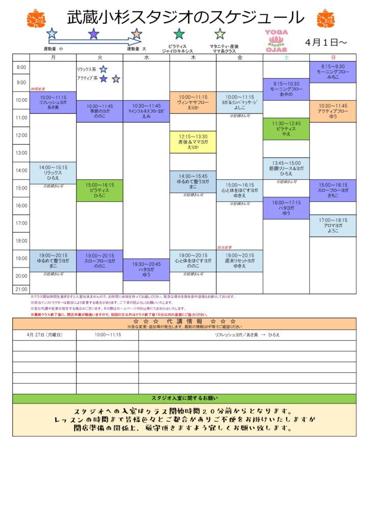 ※ヨガオージャスはハタヨガを中心にしたクラス構成・初心者の方から上級者まで幅広く受講されています。 ※体験レッスンも随時受付中です。 ヨガ 武蔵小杉のスケジュール ヨガ 西小山スタジオのスケジュール ヨガ 青葉台スタジオのスケジュール ヨガ 川崎スタジオのスケジュール ヨガ 町田スタジオのスケジュール オンラインのスケジュール 代講の情報はこちらをチェック!